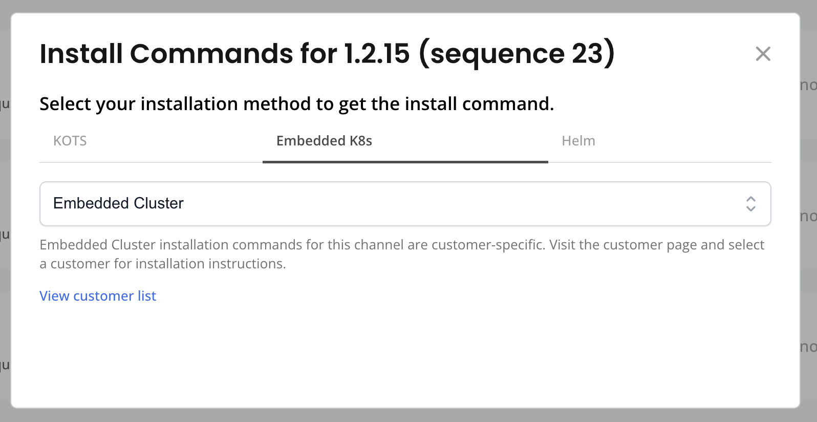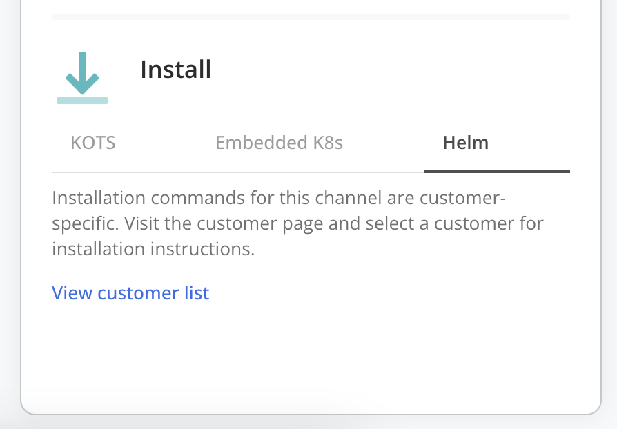 Installation instructions for the Helm CLI and Replicated Embedded Cluster are customer-specific. You can find installation instructions on the page for the target customer.